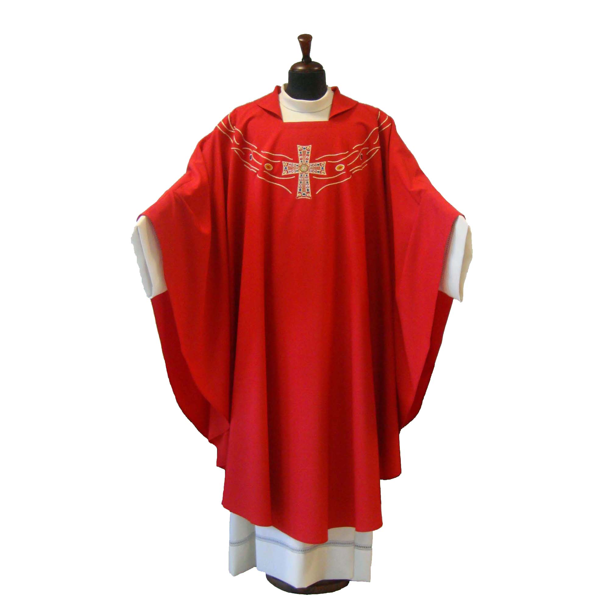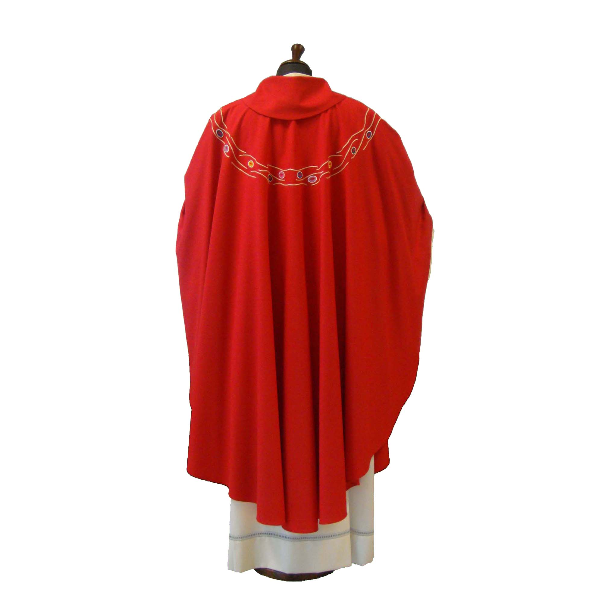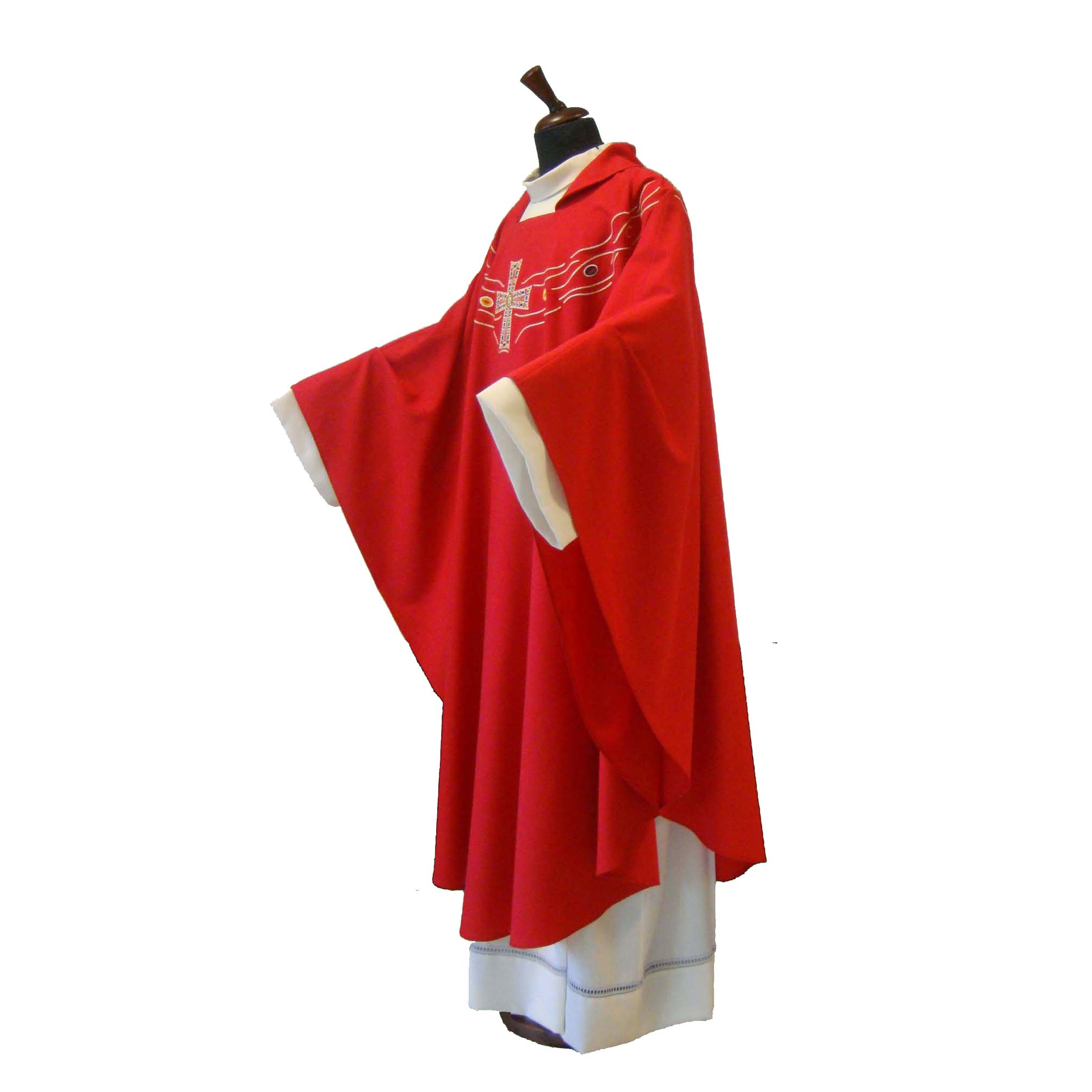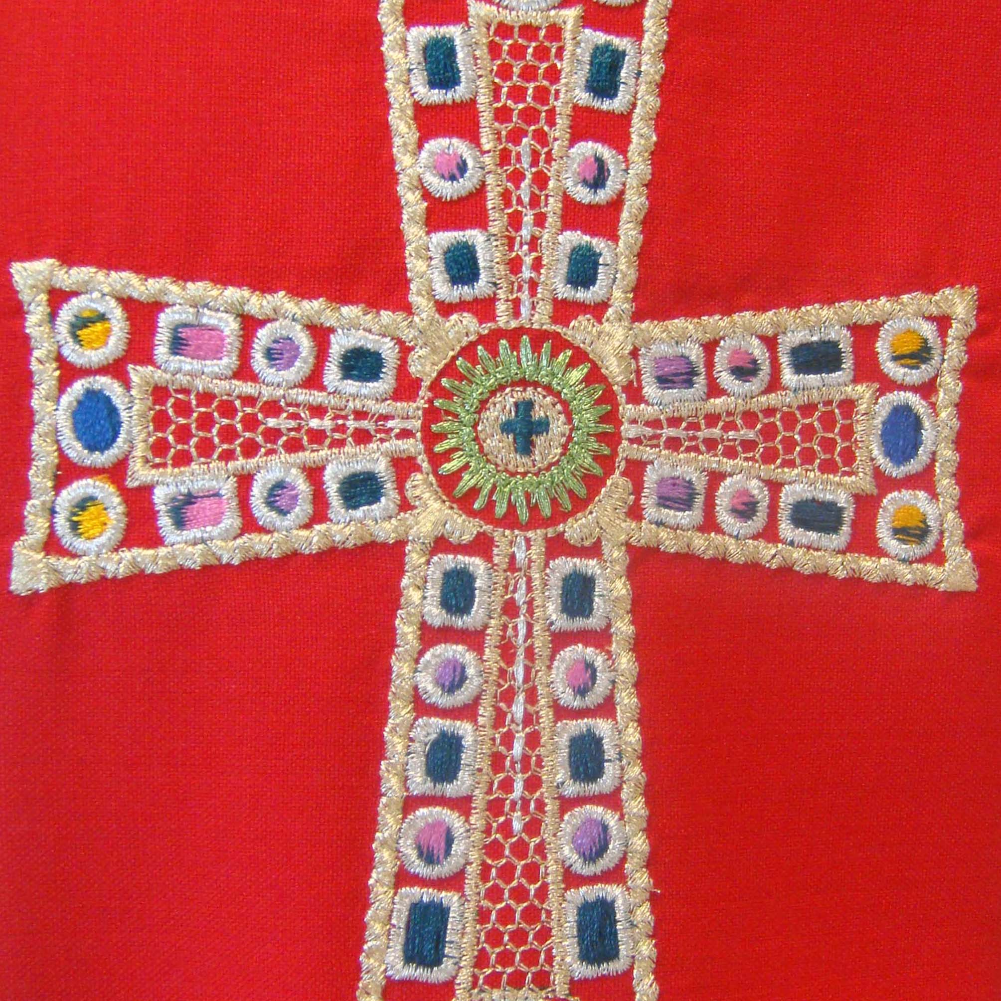 The Vatican Crux, which is reproduced in embroidery, is the oldest relic of the "treasure" of Saint Peter, kept in the Vatican. Reliquary in gilded silver and precious stones, the Vatican Crux dates back to the second half of the sixth century: it was sent as a gift, probably as an ex-voto, by Justin II, Emperor of the East (563-578).